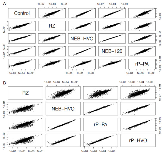 It was observed previously that using different rRNA removal methods can affect the relative read counts of some non-rRNA genes [40,41]. Therefore, we tested whether rRNA removal and the choice of removal method changes the relative levels of mRNA. We calculated the gene counts from each sample as a percentage of the total (non-rRNA) counts from that sample, and correlated these relative counts obtained from different rRNA removal techniques (see Methods, Figure 7). We observed strong correlations of normalized relative counts of non-rRNA genes among different rRNA removal methods, as well as with untreated total RNA data for HBT (Figure 7A). The Pearson’s correlation coefficients between per-gene normalized read counts across different methods used on HBT were in the range 0.91–0.99, with an average value of 0.95. Correlation with control (untreated) samples was >0.92. Similar results were seen with HVO: 0.94–0.99, average 0.97 (Figure 7B, Table S4). Note that, in HVO, the correlation of all methods to RZ is slightly lower (>0.940, Figure 7B). We surmise that this is due to differences in growth medium—RZ samples were prepared in minimal medium, whereas all other samples were prepared in rich medium (Table 2). Nonetheless, this correlation is still high and significant. Based on this analysis, we conclude that rRNA removal and the choice of removal method does not change the number of reads on a per-gene basis in halophilic archaea. These rRNA removal methods can, therefore, be used for downstream applications, such as differential gene expression analysis.