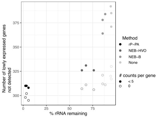 One of the most important advantages of choosing an efficient rRNA removal method is analyzing differential expression of low-count genes. In the current study, we show that efficient rRNA depletion enables increased detection of lowly expressed genes (Figure 8). This improvement in coverage of low-count genes enables correct statistical analysis of differential expression [19,20,21]. Accurate detection of lowly expressed transcripts is also important when using RNA-Seq to map the transcriptome [12,45], including in metatranscriptomic protocols [44].