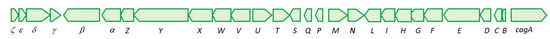 Schematic representation of cagPAI. The genetic arrangement of the 28 genes from the cagPAI of the reference strain H. pylori 26695 is depicted based on the organization proposed by Phuc et al., 2021 [26].