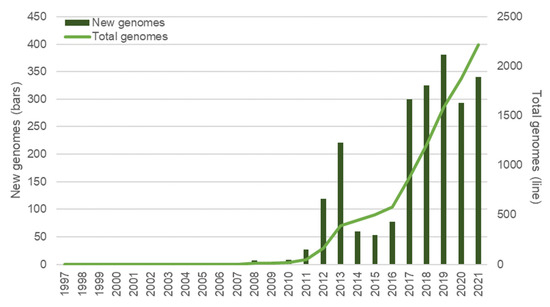 Overview of H. pylori genomes made available over time. Bars represent the new genomes released in each year; the total number of genomes available at each year is represented with a line. Data was retrieved from the PATRIC database [226] (last accessed in January 2022) and refer only to genomes submitted until the end of 2021; 34 genomes with no credible submission year were not taken into consideration for this graphic.