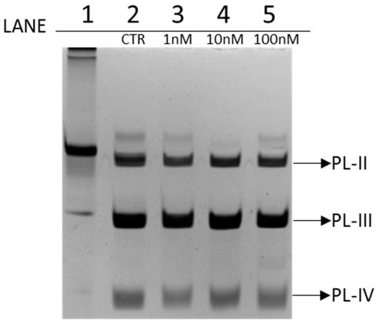 PL proteins extracted from spermatozoa of Mytilus galloprovincialis exposed to 1 nM, 10 nM, and 100 nM chromium (VI) were analyzed by AU-PAGE and SDS-PAGE to evaluate possible differences in the electrophoretic pattern compared to PLs extracted from spermatozoa of unexposed mussels. 4 µg of proteins were loaded into each well. By AU-PAGE, shown in the Figure 1, PL-II, PL-III, and PL-IV can be observed from top to bottom. In particular, in lane 1 was loaded Chaetopterus variopedatus sperm H1 histone, in lane 2 were loaded PLs extracted from unexposed mussels (CTR), from lane 3 to 5 were loaded PLs extracted from exposed mussels to 1 nM, 10 nM, and 100 nM chromium (VI), respectively.