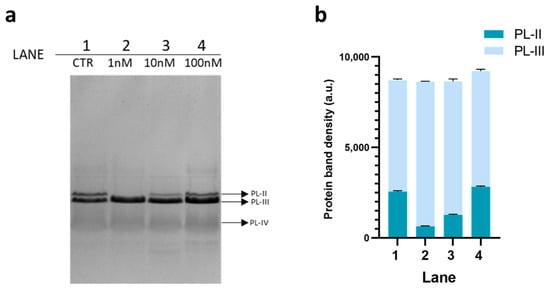 For this analysis, 6 µg of PLs were loaded on the gel for each condition. As in the previous gel, PLs extracted from unexposed mussels (CTR) were loaded in lane 1 (panel a, Figure 2), whereas in lane 2 to 4 were loaded PLs extracted from mussels exposed to the three doses of chromium (VI). In this case, the three proteins were visible in the (CTR): from top to bottom PL-II, PL-III, and PL-IV. PL-II and PL-III having very close molecular weight values (13.8 and 11.8 kDa, respectively) exhibit very similar electrophoretic mobility. The main differences observed with this type of electrophoretic analysis was a reduction of the amount of PL-II in the canonical mobility position, caused by a comigration with PL-III. In mussels exposed to 1 nM chromium (VI) compared to unexposed mussels, a total comigration of PL-II with PL-III was observed; in mussels exposed to 10 nM chromium (VI), only a fraction of PL-II comigrates with PL-III, whereas in mussels exposed to 100 nM chromium (VI), a condition similar to unexposed mussels seemed to be re-established.