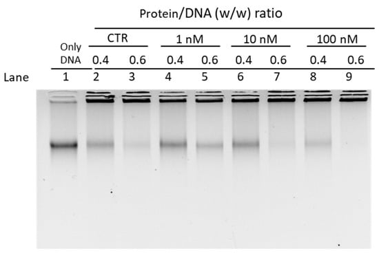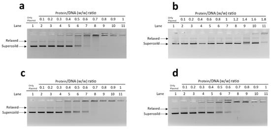 In these EMSA, a fixed DNA concentration (150 ng) and PL/DNA ratios (wt/wt), ranging from 0.1 to 1.8, were used (Figure 3). The protein-to-DNA ratio at which DNA reaches saturation was evaluated. By “saturation”, we mean the condition in which the DNA is complexed with the protein in the form of a single band near to the well, and therefore neither the band corresponding to supercoiled DNA nor that of relaxed DNA is more visible.
