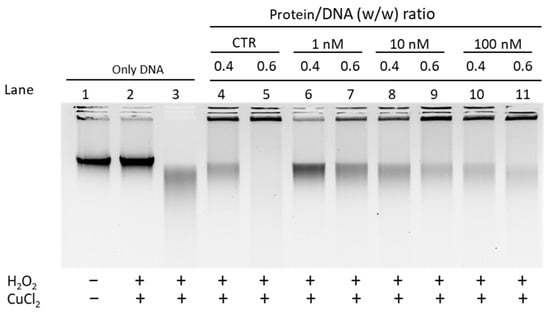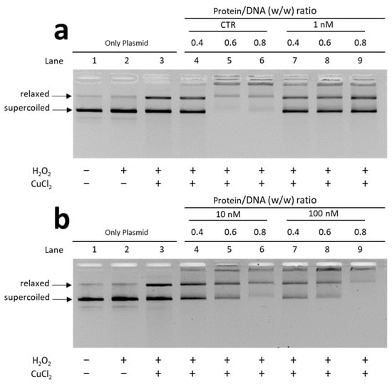 Given the differences in the electrophoretic pattern of PLs from mussels exposed and unexposed to chromium and considering the changes in the affinity of PLs for DNA, we evaluated the ability of these proteins to protect DNA from oxidative damage. DNA damage was assessed by means of a protective assay, under pro-oxidant conditions, i.e., in the presence of appropriate concentrations of H2O2 and CuCl2 as specified in Materials and Methods in order to cause the Fenton reaction. The experiments were conducted using both plasmid DNA and genomic DNA extracted from unexposed mussels (sperm DNA). Below we first show the results obtained using plasmid DNA (Figure 5)