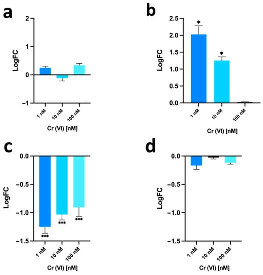 For the hsp70 gene (see panel a), no significant changes in expression were observed in the three different exposure conditions compared to unexposed mussels. For the mt10 gene (see panel b), there was an increase in expression of two-fold and about one-fold following 1 nM and 10 nM chromium (VI) exposure, respectively, compared to unexposed mussels. In mussels exposed to 100 nM chromium (VI), instead no change in expression was observed compared to unexposed mussels. For the PL-II/PL-IV gene (see panel c), a down-regulation of expression was observed after exposure, which was more relevant in the 1 nM chromium (VI) exposure condition, resulting in about 1.3-fold lower than in unexposed mussels. For the PL-III gene (see panel d) for all exposure conditions no significant changes in expression were observed compared to unexposed mussels.