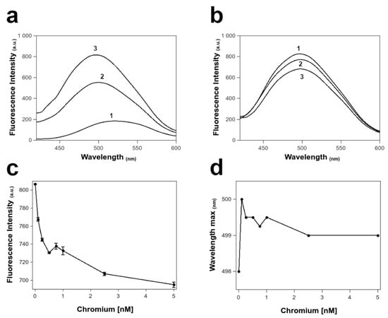 ANS-PLs fluorescence analysis. (a) Spectra of ANS fluorescence emission alone (1) and in presence of PLs at (2) 0.01 mg/mL and (3) 0.02 mg/mL. (b) Spectra of ANS fluorescence emission in presence of PLs at increasing concentration of chromium (VI) (1 = 1 nM, 2 = 10 nM, 3 = 100 nM). (c) Plot of the maximum fluorescence intensity values of ANS in presence of PLs at increasing concentration of chromium (VI) in the range from 0 to 5 nM. (d) Plot of the maximum fluorescence emission wavelength of ANS in presence of PLs at increasing concentration of chromium (VI) in the range from 0 to 5 nM. All measurements in (c,d) were performed at least three times at room temperatures.