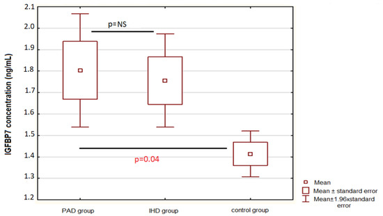 Patients with PAD had a significantly higher IGFBP-7 concentration than the control group—1.80 ± 1.62 ng/mL vs. 1.41 ± 0.45 ng/mL, p = 0.04. No significant differences between PAD patients and IHD patients were found—1.80 ± 1.62 ng/mL vs. 1.76 ± 1.04 ng/mL, p = 0.78—Figure 1.