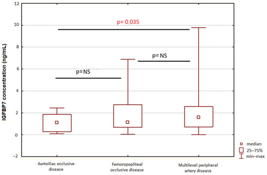 According to our findings, patients with PAD have significantly higher concentrations of IGFBP-7 than individuals representing the local population. Those with multilevel peripheral artery disease had a significantly higher concentration than patients with the aortoiliac occlusive disease; however, due to the small size of the study group and highly asymmetrical distribution, this data could be inaccurate and may depend on confounding factors. There were no significant differences between other types of PAD.