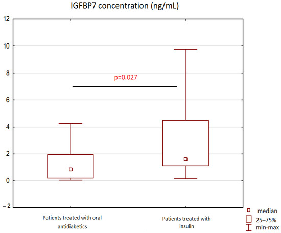 We have also found that diabetic patients treated with insulin had significantly higher IGFBP-7 concentrations than those treated with oral hypoglycemic drugs—median 0.86 ng/mL (IQR 0.19—1.95) vs. 1.57 ng/mL (IQR 1.12–4.5), p = 0.027, respectively—Figure 3.