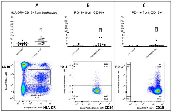 Myeloid cells. Three myeloid subsets were associated with treatment failure. The top row shows the % positive from the parent population for responders and non-responders. Left column: responders; right column: non-responders. The bottom row shows the FACS gating. Left (A): HLA-DR+ CD16+ (medium) monocytes % from leukocytes. Middle (B): PD-1+ monocytes % from CD14+ monocytes. Right (C): PD-1+ granulocytes % from CD15+ granulocytes. Significance was indicated as * p < 0.05.