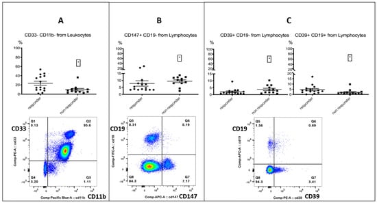 Lymphocytes. The top row shows the % positive from the parent population for responders and non-responders. Left column: responders; right column: non-responders. The bottom row shows the FACS gating. Left (A): CD33- CD11b- population % from leukocytes, associated with response. Middle (B): CD147+ CD19- lymphocytes % from lymphocytes, associated with treatment failure. Right (C): CD39+ CD19- lymphocytes % from lymphocytes, associated with treatment failure and CD39+ B cells, associated with response. Significance was indicated as * p < 0.05.