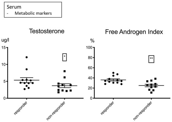 Testosterone µg/L (left) and the free androgen index % (right) shown for male responders and non-responders. Higher levels were associated with response to treatment. Significance was indicated as * p < 0.05, ** p < 0.01.