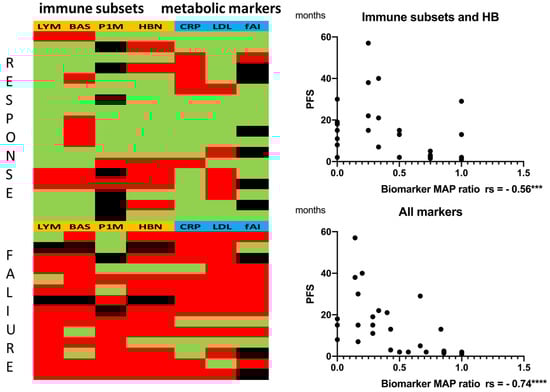 (Left biomarker heatmap) Immune subsets and hemoglobin (orange): LYM = absolute lymphocyte counts, BAS = absolute basophil counts, P1M = PD-1+ monocytes, HBN = hemoglobin. Metabolic markers (blue): CRP = C-reactive protein, LDL = low-density lipoprotein, fAI = free androgen index. Green: value within range, responder. Red: value within range, non-responder. Black: no data (fAI only for male patients: 8 patients were female). A ratio (biomarker map ratio) was formed by dividing the red fields by the total fields (green and red fields). (Right) Correlation between the biomarker map ratio and PFS: (Top) immune subsets only (with hemoglobin). (Bottom) immune subsets combined with metabolic markers. Statistics are reported in Supplemental Data S5 and S6. Significance was indicated as *** p < 0.001 and **** p < 0.0001.