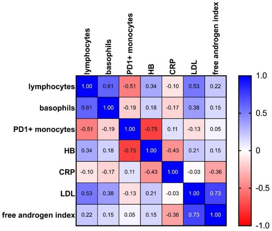 In a third step, we performed a multiple correlation analysis to search for coherences between the markers of interest (Figure 5, Supplemental Data S4). Due to the high number of tests, Bonferroni correction was conducted. In addition to a strong positive correlation between LDL and the free androgen index (rs = 0.73, p = 0.0000745 **** and corrected p = 0.00298 **) and between lymphocytes and basophils (rs = 0.61, p = 0.0003 *** and corrected p = 0.012 *), an intriguing inverse correlation was revealed between PD-1+ monocytes and hemoglobin (rs = −0.755, p = 0.0000769 **** and corrected p = 0.003076 **).