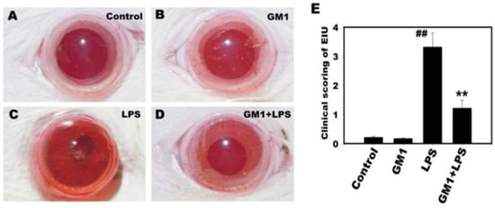 The pathology of uveitis is basically caused by excessive inflammatory conditions []. LPS is one of the most effective stimulants that triggers proinflammatory responses. EIU is a well-established model for investigating the pathological mechanism of ocular inflammation and evaluating the therapeutic efficacy of potential anti-inflammatory agents. Administration of LPS induces the infiltration of inflammatory cells in the ICB and increases protein concentration in the AqH of rats with EIU, accompanied by clinical pathological symptoms, including conjunctival chemosis (edema), erythema (redness) and ocular discharge. However, GM1 alleviated these clinical symptoms and reduced LPS-induced increases in protein and the number of infiltrating cells, indicating the anti-inflammatory effects of GM1.