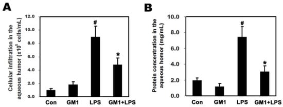 Effects of GM1 on cellular infiltration and protein concentration in the AqH of rats with EIU. Rats were pretreated with GM1 and then treated with or without LPS for another 24 h. The AqH was collected from each group, cells were counted, and the protein concentration was measured by a blinded observer. GM1 significantly decreased cellular infiltration (A) and protein concentration (B) in the AqH of EIU rats. The data are presented as the mean ± SD. # p < 0.05 compared with the control group; * p < 0.05 compared with the LPS-treated group. n = 6 rats per group. AqH: aqueous humor.
