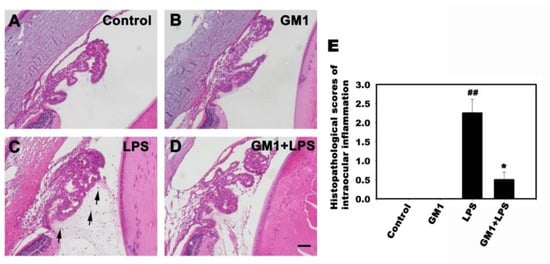 The histopathological analysis of the effect of GM1 on the anterior segment of rats with EIU was performed using H&E staining. As shown in Figure 3, the morphological data indicated no cellular infiltration adjacent to the ICB of the anterior segment in either the control (Figure 3A) or GM1 alone group (Figure 3B). Conversely, in the LPS group, the histological evaluation revealed the accumulation of cells infiltrating into the anterior segment (Figure 3C). Compared with the LPS group, the GM1+LPS group showed a reduction in cellular infiltration (Figure 3D). The severity of histological changes was evaluated by histopathological scoring with a scale ranging from 0 to 3 (see the Section 2). GM1 significantly attenuated LPS-induced histopathological scores in rats with EIU (Figure 3E). Therefore, GM1 prevented LPS-induced histopathological changes in rats with EIU.