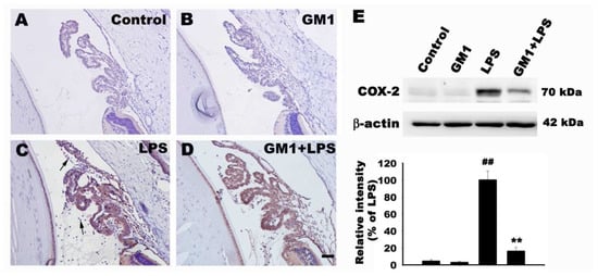The expression of ICAM-1, an adhesion protein expressed in the epithelium of the ICB, is induced by LPS []. ICAM-1 participates in cellular infiltration during inflammation. ICAM-1 is recognized by inflammatory cells and is involved in rolling and adhesion [,]. Systemic administration of anti-ICAM-1 monoclonal antibodies has been shown to inhibit LPS-induced cellular infiltration into the anterior segment of the eye []. In this study, GM1 reduced macrophage activation; therefore, it decreased LPS-induced inflammation and ICAM-1 expression, contributing to a reduction in the infiltration of COX-2-positive cells.