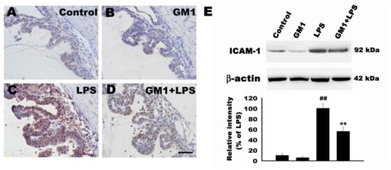 Previous studies have reported an important role for increased ICAM-1 expression in inflammatory cell infiltration during EIU []. We examined the effects of GM1 on ICAM-1 expression in the ICB of rats with EIU using immunohistochemical staining. As shown in Figure 5, the ICB constitutively expressed low levels of ICAM-1 in both the control (Figure 5A) and GM1 alone groups (Figure 5B); however, in the LPS group, the ICB expressed high levels of ICAM-1 (Figure 5C). Compared to the LPS group, ICAM-1 expression was markedly reduced in the GM1+LPS group (Figure 5D). Western blot analysis further confirmed that GM1 attenuated LPS-induced ICAM-1 expression in rats (Figure 5E). The results indicated that GM1 reduced ICAM-1 expression and contributed to attenuating the recruitment of inflammatory cells adjacent to the ICB in rats with EIU.