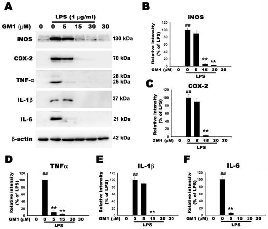 Effect of GM1 on the protein levels of proinflammatory mediators in LPS-stimulated RAW 264.7 cells. (A) Cells were pretreated with different concentrations of GM1 (5, 15, 30 μM) for 1 h, stimulated with LPS (1 μg/mL) for 8 h, and then subjected to Western blot analysis with anti-iNOS, anti-COX-2, anti-TNF-α, anti-IL-1β and IL-6 antibodies; β-actin was used as an internal control. (B–F) The protein bands from each treatment group were quantified using densitometry. Data are presented as percentages of the LPS-treated group (mean ± S.D., n = 3). ## p < 0.01 compared with the control group; ** p < 0.01 compared with the LPS-treated group.