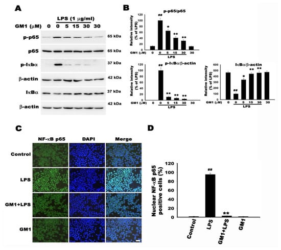 This study investigated whether GM1 affects the activation of NF-κB to further elucidate the anti-inflammatory mechanism of GM1. NF-κB is a protein complex consisting mainly of p50 and p65 heterodimers that is an inducible transcription factor regulating DNA transcription and proinflammatory factor production during inflammation. In the inactivated state, NF-κB activity is inhibited by a physical interaction with IκBα, whereas upon stimulation by LPS, IκBα is phosphorylated by IκB kinase and dissociates from NF-κB, and is subsequently degraded via the ubiquitin–proteasome pathway. Free p50 and p65 are activated, and phosphorylated p65 and p50 are then translocated to the nucleus where they function as transcription factors to induce the expression of proinflammatory genes [,]. In the present study, GM1 inhibited the LPS-induced phosphorylation and degradation of IκBα in RAW 264.7 cells along with phosphorylation of NF-κB p65 and nuclear translocation. Therefore, GM1 can suppress LPS-induced expression of proinflammatory molecules by inhibiting the activation of NF-κB p65.