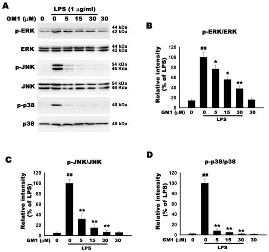 Effect of GM1 on MAPK activation in LPS-stimulated RAW 264.7 cells. (A) Cells were pretreated with various concentrations of GM1 (5, 15, 30 μM) for 1 h and then stimulated with LPS (1 μg/mL) for 1 h. Cell lysates were subjected to Western blotting to determine levels of MAPK proteins (p-ERK/ERK, p-JNK/JNK and p-p38/p38). (B–D) Quantitative analysis of MAPK protein levels. Data are presented as percentages relative to the LPS group (mean ± SD, n = 3). ## p < 0.01 compared with the control group; * p < 0.05 and ** p < 0.01 compared with the LPS treatment group.