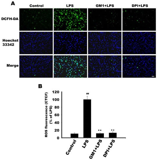 Effect of GM1 on LPS-stimulated ROS production by LPS-stimulated RAW 264.7 cells. (A) Cells were pretreated with 30 μM GM1 or 500 nM DPI and then stimulated with LPS for 9 h. Intracellular ROS level was measured using the DCFH-DA assay. Bar = 50 μm. (B) Quantification of ROS level. Staining intensity was measured as corrected total cell fluorescence (CTCF). Data are expressed as a percentage of the LPS-treated group (mean ± SD, n = 3). ## p < 0.01 vs. control group; ** p < 0.01 vs. LPS-treated group.