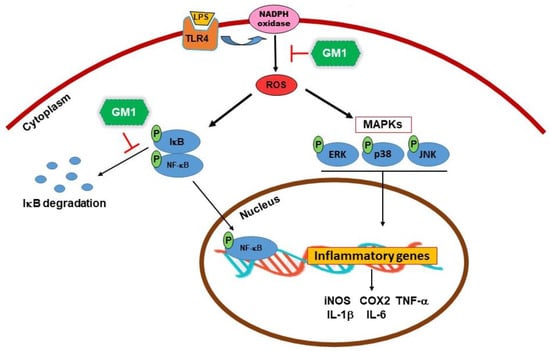 In addition, the NOX inhibitor diphenylene iodonium (DPI) also significantly inhibited LPS-induced ROS production, suggesting that NOX activation is required for LPS-induced ROS formation. GM1 inhibited the activation of NF-κB and MAPKs signaling, which may be partially attributed to its potent downregulation of NOX-mediated ROS production. Figure 11 summarizes the possible mechanisms by which GM1 inhibits inflammatory responses.