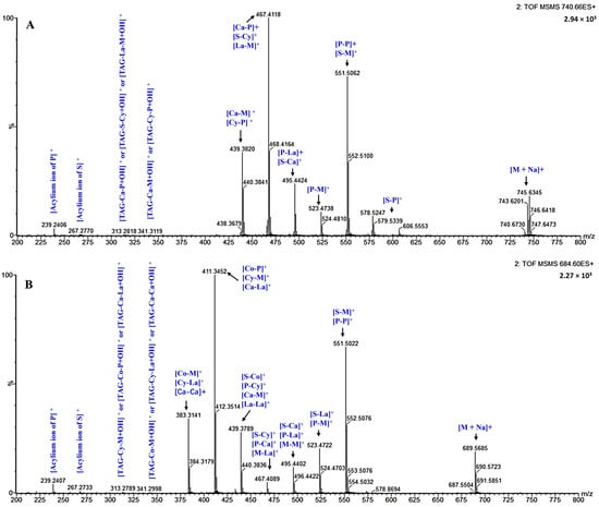 Figure 2A,B displays the identification of the MS/MS spectra and fragmentations of the major TAGs detected in the GZG and XSG samples, respectively. Identification of TAGs was achieved using the parental ion in conjunction with the loss of daughter ions available via mass spectrometry []. For instance, the multiple TAGs of GZG milk at m/z 740.6712 (Figure 2A) were identified as follows: the daughter ions of S-M-Ca TAG were [Ca-M]+:439.3820, [S-Ca]+:495.4424 and [S-M]+:551.5062, and they were formed from the neutralization of capric, myristic and stearic acids in conjunction with ammonia. The daughter ions of P-P-Ca TAG were [Ca-P]+:467.4118 and [P-P]+:551.5062 due to the neutralization of capric and palmitic acids in conjunction with ammonia. The daughter ions of S-P-Cy TAG were [Cy-P]+:439.3820, [S-Cy]+:467.4118 and [S-P]+:579.5339, originating from the neutralization of stearic, palmitic and caprylic (C8:0) acids in conjunction with ammonia. The daughter ions of P-M-La TAG were [La-M]+:467.4118, [P-La]+:495.4424 and [P-M]+:523.4738, corresponding to the neutralization of lauric (C12:0), myristic and palmitic acids in conjunction with ammonia. According to Abed et al. [], the mass spectra of ammoniated TAG [M + NH4]+ included three main fragment ions as follows: (1) a free FA acylium ion, (2) a protonated monoglyceride ion, obtained after the TAG molecule loses two FAs, and (3) diglyceride (DAG) ions, obtained after losing one FA. For instance, as illustrated in Figure 2A, the MS/MS spectrum of S-M-Ca TAG displayed the corresponding ions: an acylium ion of stearic (S, m/z 267.2770), a protonated monoglyceride ion of [TAG-Ca-M + OH]+ (m/z 341.3119) and DAG fragment ions of m/z 439.3820, 495.4424 and 551.5062, which formed because of the neutralization of stearic, myristic and capric acids, respectively. The MS/MS spectrum of P-P-Ca TAG displayed an acylium ion of palmitic (P, m/z 239.2406), a protonated monoglyceride ion of [TAG-Ca-P + OH]+ (m/z 313.2818) and DAG fragment ions of m/z 467.4118 and 551.5062, produced because of the neutralization of palmitic and capric acids, respectively. The MS/MS spectrum of S-P-Cy TAG presented an acylium ion of palmitic (P, m/z 239.2406) or an acylium ion of stearic (S, m/z 267.2770), a protonated monoglyceride ion of [TAG-S-Cy + OH]+ (m/z 313.2818) or [TAG-Cy-P + OH]+ (m/z 341.3119) and DAG fragment ions of m/z 439.3820, 467.4118 and 579.5339, which formed because of the neutralization of stearic, palmitic and caprylic acids, respectively. The MS/MS spectrum of P-M-La TAG exhibited an acylium ion of palmitic (P, m/z 239.2406), a protonated monoglyceride ion of [TAG-La-M + OH]+ (m/z 313.2818) and DAG fragment ions of m/z 467.4118, 495.4424 and 523.4738 due to the neutralization of palmitic, myristic and lauric acids, respectively. The identification of the MS/MS spectra and of the fragmentations of the main TAG molecular species in XSG at m/z 684.6094 (Figure 2B) followed the same explanation.