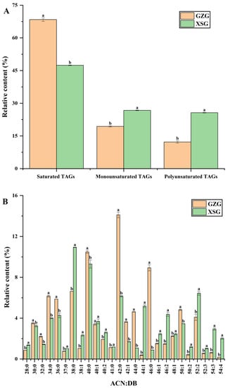 Figure 3. (A) Saturation distribution of TAGs; (B) Molecular weight distribution of TAGs (>1% of total TAGs) presented as ACN:DB (acyl carbon number:number of double bonds). GZG, Guanzhong goat milk; XSG, Xinong Saanen goat milk. Results represent mean ± standard deviation (indicated by vertical error bars), n = 3. Columns bearing different letters indicate statistical difference (p ≤ 0.05) between the two goat dairy breeds by independent samples t-test.