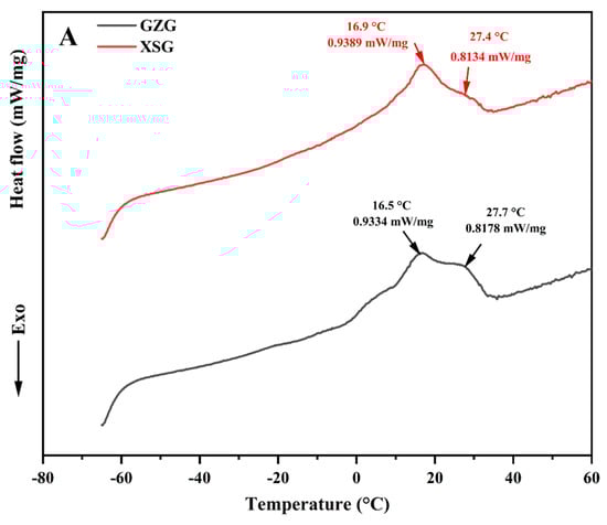 Melting and crystallization thermal behaviors are important indicators for understanding the fats’ physical conditions within the human body, as well as their applications. The differences in the melting and crystallization thermal profiles of MF fractions are attributed to their diverse relative content of FAs and/or TAGs []. As shown in Figure 4A, the DSC melting curves presented two endothermic peaks at 16.9 °C and 27.4 °C for XSG and 16.5 °C and 27.7 °C for GZG. These peaks were ascribed to two melting profiles of MF fractions, i.e., middle melting and high melting. Indeed, it has been reported that MF usually exhibits a wide range of melting points varying from −40 to 40 °C because of the large number of TAGs with a large range of chain lengths and saturation degrees. MF frequently displays three overlapping endotherms: low melting with values below 10 °C, middle melting with values between 10 °C and 20 °C and high melting with values above 20 °C []. The middle melting temperature of XSG samples was slightly higher (16.9 °C) than that of GZG samples (16.5 °C), probably due to the lower relative content of medium-chain SFAs (Table 1). In contrast, the lower temperature of fat melting (27.4 °C) at the high melting fraction for XSG samples might be due to the higher relative content of monounsaturated FAs (Table 1), particularly oleic acid. Sun et al. [] stated that a high oleic acid content decreases the TAGs’ melting point, thus, providing the fluidity needed to transport and metabolize the MF globules. In addition, the existence of palmitic acid in the TAG molecular species of the GZG samples and highly saturated TAG molecular species could result in a higher melting temperature at 27.7 °C []. Overall, both types of GMF melted below normal human body temperature, which may improve the metabolism and melting at body temperature when included in IF. Moreover, the MF crystallization thermal behavior was also investigated since it is imperative for the processing and texture of dairy products, influencing the spread ability, mouthfeel, appearance and taste []. Two crystallization peaks were detected in both breeds; the first point was at −7.1 °C and −8.0 °C, and the second one reached −32.8 °C and −28.5 °C for XSG and GZG, respectively (Figure 4B). The melting and crystallization behaviors found in this study differed from those reported by Sbihi et al. [] for GMF from Saudi Aradi goats (two melting points at 15.4 °C and 38.7 °C and one crystallization point at 1.9 °C). These disparities may be due to the variation in the GM breed and their FA and TAG compositions.