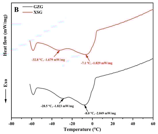 Figure 4. Melting (A) and crystallization (B) profiles of goat milk fat samples analyzed by differential scanning calorimetry. Guanzhong goat milk (GZG, black curve), Xinong Saanen goat milk (XSG, red curve).