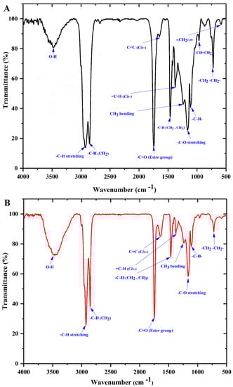FT-IR spectra are considered as fingerprint profiles for oils and/or fats since the infrared spectrum absorption in a lipid is caused by existing FAs []. As far as we know, there is no research in the literature related to the characterization of and comparison among the spectroscopic patterns of GMF types using FT-IR. Representative FT-IR spectra of the GMF samples extracted from GZG and XSG are exhibited in Figure 5A,B. It can be seen that the FT-IR spectra of the analyzed GMF samples were comparable, except for slight differences in the intensity of the peaks that could be ascribed to the number of FA compositions in each type of GM, with a higher content of the FA types resulting in higher IR absorption [,]. The moderate band at 3474 cm−1 is related to the overtone of the functional group of -C=O )ester) [], while the strong absorption peaks at 2924 cm−1 and 2852 cm−1 relate to the asymmetric and symmetric stretching vibrations of the -C-H (CH2) groups, respectively []. Moreover, the peaks at 1748 cm−1 and 1644 cm−1 are ascribed to the stretching of the -C=O (ester) and -C=C- (cis) groups, respectively, as previously reported by Sbihi et al. []. The peaks at 1463 cm−1 and 1374 cm−1 are respectively related to the bending vibrations of the -C-H (CH2, CH3) and -C-H (CH3) symmetric, while the bands at 1237 cm−1 and 1165 cm−1 are both correlated with the vibration of C-O ester stretching groups and of the CH2 bending group, and both are associated with the percentage of saturated acyl groups in the GMF samples []. Additionally, the weak band near 1110 cm−1 is ascribed to the C-O ester stretching group’s vibration. Finally, the two peaks near 964 cm−1 and 724 cm−1 are due to -HC=CH-(trans) out of plane bending vibration and the bending vibration of -(CH2)n- rocking groups and out-of-plane bending vibration of -HC=CH-(cis), respectively. Sbihi et al. [] noted that the analyzed FT-IR spectra of Saudi Aradi goat fat were characterized by 15 peaks, whereas, in our study, only 12 peaks were detected. These disparities may be related to the composition of their fat fractions concerning chain length and unsaturation degree. Overall, the integration of the bands derived from the spectra for each milk type confirms the above differences in GMF composition for each breed with higher absorption values for GZG milk fat.