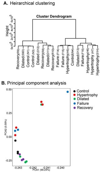 All the analysed samples were clustered hierarchically on the basis of the expression of all genes (the presence of transcripts), and the clustering reflects the relationship between the samples (Figure 1A). Samples H6, H7, and S1H (hypertrophy) are very similar in their gene expression pattern and thus they were clustered closely. While a dilated (D13) sample and a failure (F16) sample were very similar in their gene expression. One hypertrophy (H5) sample was closely related to the control (N4) sample in gene expression. Two dilated (D12 and D11) and two recovery (R8 and R10) samples also showed similarity in their transcript expression. Two controls (N1 and N3) were also similar to a recovery (R9) and a dilated sample (S9D). We used principal component analysis (PCA) to broadly understand how closely the gene expression levels between each sample were and visualised the clustering of samples for the most differentially expressed genes. Using the PC1 and PC2, some of the biological samples of different stages displayed some overlap in the differential gene expression pattern (Figure 1B).