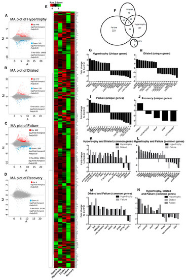 Characteristics of differential gene expression. (A–D) The MA plots of the hypertrophy through recovery compared to control show the total expression of genes. The X-axis represents value A (log2-transformed mean expression level of each gene). The Y-axis represents value M (log2-transformed fold change of each gene). Red dots represent upregulated DEGs. Blue dots represent downregulated DEGs. Gray points represent genes that are not differentially expressed. (E) Heat map showing the differentially expressed genes in each group. (F) The Venn diagram shows the distribution of DEGs between the groups. (G–N) Top up-/downregulated genes that are either unique to a group or common to two or more groups are shown.