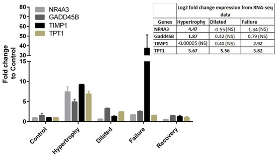 In the dilated stage, TMEM205, ADIRF, C6H4orf48, NGRN, PROSER1, ERICH2, and CINP were not previously linked to cardiovascular diseases. In contrast, some genes in the possible candidate gene list of the failure stage have been previously implicated in some cardiac pathology. In the failure stage, eight potential candidate genes were identified as upregulated, and nine as downregulated. For example, the ANKRD2 gene, which is known to play a role in carcinogenesis and myogenesis, exhibited an increased expression in human DCM as a titin-binding protein [44]. Another example is the gene LITAF, which regulates the calcium ion channels in the heart [45]. Overexpression of LITAF in rabbit cardiomyocytes decreases the expression of CaV1.2 (subunit of L-type voltage-dependent calcium channel), thereby shortening the duration of the action potential. An intergenic variant of METTL11B is found in atrial fibrillation [46]. The other genes in the possible candidate gene list such as FKBP10, OLFML3, SKP-1, PIGZ, PACRG, INSYN1, DQA, CHST2, CITED1, SBK2, and RBFOX3 have been highly significantly regulated in the failure stage. All in all, this study identified potential novel target genes in cardiac hypertrophy, dilatation, and HF, and a systematic approach is needed to ascertain their role in these pathological stages.