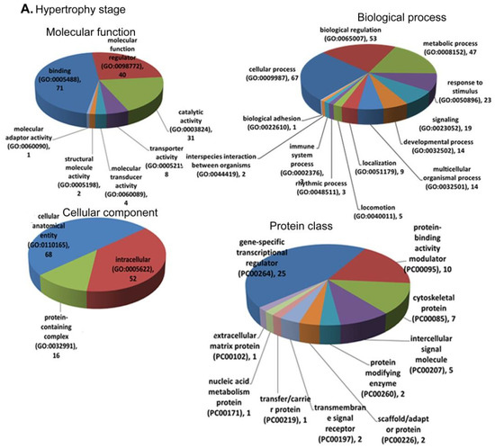 The significantly expressed genes in each stage were subjected to functional classification and enrichment analysis using the PANTHER database for biological process (BP), molecular function (MF), cellular component (CC), PANTHER pathways, and protein class. Figure 4A–C depicts the enrichment of MF, BP, CC, and PANTHER protein class (PC) for hypertrophy, dilated, and failure stages. The recovery stage did not retrieve any significant functional annotation because there were not many genes differentially regulated between control and recovery. The cellular process was the most enriched GO term under the BP for all three stages. The most enriched MF was binding, followed by molecular function regulator in the hypertrophy, and catalytic activity in the dilated and failure stages. The enrichment of PANTHER protein class in hypertrophy revealed 25 genes that are of gene-specific transcriptional regulator class. In the dilated stage, seven genes enriched the cytoskeletal protein class. In the LV failure stage, the most enriched protein class was metabolite interconversion enzymes with 26 genes.
