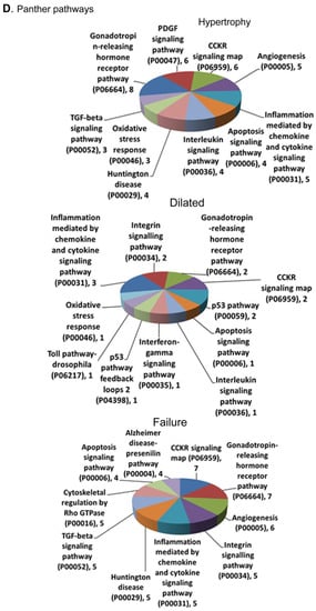 PANTHER pathway (Figure 4D) analysis showed a significant contrast between hypertrophy and failure compared to dilated stage. In hypertrophy, enrichment for PANTHER pathways retrieved nine pathways as significantly enriched. GnRH receptor signalling pathways enriched with eight genes provide the possibility of the activation of this pathway. It is already known that GnRH agonists used in androgen deprivation therapy in prostate cancer increase the risk of cardiovascular diseases [27]. Likewise, the gene-enriched GnRH pathway may be playing a role in the initiation and progression of hypertrophy of the heart. The other significantly enriched pathways in hypertrophy are PDGF signalling pathway (six genes), CCKR (cholecystokinin receptor) signalling pathway (six genes), angiogenesis (five genes), and inflammation by chemokine and cytokine signalling pathway (five genes). The most enriched pathway in the dilated stage was inflammation mediated by chemokine and cytokine signalling pathway (three genes), followed by integrin signalling pathway, GnRH receptor pathway, p53 pathway, and CCKR signalling (two genes in all). It may be possible that in the dilated stage, there may be a deprivation of protein synthesis, which can impair the function of LV. In the failure stage, the most enriched pathways are GnRH receptor pathway (seven genes) and CCKR signalling (seven genes), followed by angiogenesis (six genes) and the integrin signalling pathway (five genes).