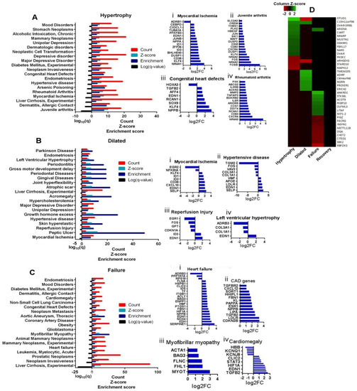 We performed disease annotation to the DEGs in each stage using DisGeNET. In the hypertrophy stage, the DEGs most significantly enriched juvenile arthritis. However, the highest number of genes in the hypertrophy stage was associated with experimental liver cirrhosis. In the dilated stage, the most significant enrichment was found with myocardial ischemia. The highest number of genes in the dilated stage enriched peptic ulcer. In the failure stage, experimental liver cirrhosis was the most significant disease associated with DEGs (Figure 5A–C). The DEGs in the hypertrophy stage that significantly enriched myocardial ischemia, juvenile arthritis, congenital heart disease, and rheumatoid arthritis are provided in Figure 5A(i–iv). In the dilated stage, the genes that are significantly enriched myocardial ischemia, hypertensive disease, reperfusion injury, and left ventricular hypertrophy are provided in Figure 5B(i–iv). In the failure stage, 21 DEGs were directly related to heart failure (Figure 5C(i)). DEGs expressed in the failure stage related to coronary artery disease, myofibrillar myopathy, and cardiomegaly are given in Figure 5C(ii–iv). Thereafter, the transcripts that were not previously reported to be associated with any cardiovascular diseases were filtered from DEGs of each stage. Figure 5D represents the heatmap of those genes that are potential candidate genes for future cardiovascular research. In the hypertrophy stage, OTUD1 (OUT deubiquitinase 1), ARID5A (AT-rich interaction domain 5A), and CNTFR (ciliary neurotrophic factor receptor) are possible targets of further study. In the dilated stage, TMEM (transmembrane protein 205), ADIRF (adipogenesis regulatory factor), and NGRN (neugrin, neurite-outgrowth-associated) can be potential targets. In the failure stage, ANKRD2 (ankyrin repeat domain 2), STK38L (serine/threonine-kinase-38-like), and ACOT9 (acyl-CoA thioesterase 9) are possible novel targets.