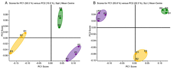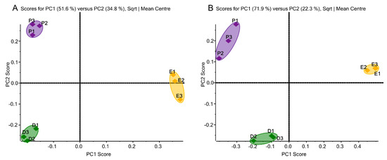 Figure 4. Unsupervised principal component analysis of O-glycans derived from (A) the 231BR cell line, with 20 glycans, 9 glycans, and 22 glycans identified in DMEM, EMEM, and Plasmax, respectively, and (B) the CRL cell line, with 28 glycans, 18 glycans, and 27 glycans identified in DMEM, EMEM, and Plasmax, respectively. Symbols are the same as in Figure 1.