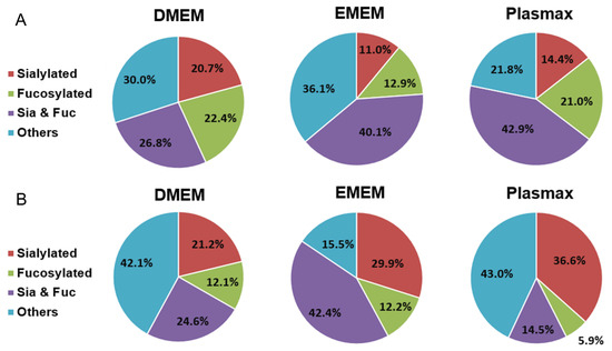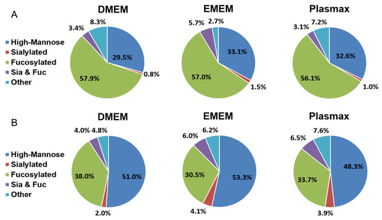 Figure 3. Distribution comparison of different types of N-glycans derived from (A) the 231BR cell line and (B) CRL cell line cultivated in DMEM, EMEM, and Plasmax.