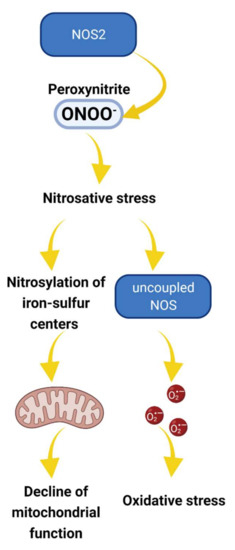 The proposed role of NOS2 in nitrosative stress and pathogenesis of podocyte and glomerular diseases. Under pathological conditions such as hyperglycemia, cellular production of NO and reactive oxygen species (ROS) are increased, promoting peroxynitrite (ONOO−) production [50]. Peroxynitrite and other reactive nitrogen species oxidatively inactivate different mitochondrial proteins, affecting the iron–sulfur centers and altering mitochondria function. Alternatively, nitrosative stress results in NOS uncoupling, further increasing O2− production and oxidative stress [51]. Overall, the cascade of events may alter mitochondria activity and promote redox imbalance leading to irreversible damage and podocyte dysfunction.