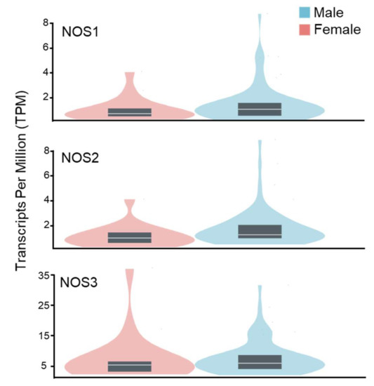 The expression of NOS isoforms in kidney tissue under normal physiological conditions is similar for male and female subjects (Figure 3). However, several studies suggested that changes in NOS expression and corresponding mechanisms of NO signaling in males and females could be significantly different in pathological conditions [54]. Female spontaneous hypertensive rats (SHR) exhibit increases in the NO-sGC pathway in renal tissue, as well as significant elevation in NOS1 and NOS3 synthases expression in the inner medulla [55,56]. In contrast, Zucker diabetic rats’ kidneys show higher levels of NOS1 and NOS3 in males than in females [57]. Thus, possible sexual dimorphisms in the expression of NOS synthases in podocytes should be considered for future studies on the role of NO in glomerular pathology.