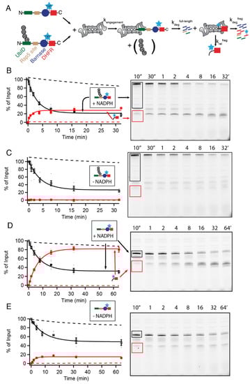 Proteasomal unfolding ability depends on targeting mechanism and substrate stability. (A) Unfolding ability assay where proteasome degradation proceeds with the engagement of ubiquitinated or nonubiquitinated substrate (kengagement), unfolding and degrading of barnase (kdegfull-length), and then either irreversible release (krelfrag) or degradation (kdegfrag) of DHFR. The ratio of kdeg to krel describes the unfolding ability (U) of the proteasome. (B–E) Degradation of 20 nM ubiquitinated (B,C) or nonubiquitinated (D,E) Rpn41–80-PPXY-Barnase∆KL89G-C-DHFRk∆C by 100 nM WT proteasome in the presence (B,D) or absence (C,E) of 500 µM NADPH. Example gels show full-length substrate outlined in black and DHFR fragment outlined in red. Full-length (open squares) and DHFR fragment (closed squares) are shown as a percentage of total full-length present at the beginning of the reaction; full length is quantified as the sum of ubiquitinated and nonubiquitinated substrate so any deubiquitination is not misinterpreted as degradation. Dots are the results from individual experiments and error bars represent the SEM of 4–5 experiments. Dashed lines are fits in the absence of proteasome from Figure S3.
