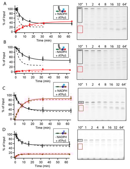 Substrate is folded in a native state and stabilized by NADPH. (A,B) Proteolysis of 80 nM Rpn41–80-PPXY-Barnase∆KL89G-C-DHFRk∆C (black squares, red triangles) and 2.5 µg/mL FITC-Casein (green circles) by 0.0125 mg/mL Thermolysin at (A) 30 °C and (B) 10 °C. Example gels show full-length, nonubiquitinated substrate in the presence (outlined in black) and absence (outlined in red) of NADPH, and FITC-casein (outlined in green). Full-length substrate is shown as a percentage of total full-length present before the addition of thermolysin. Dots are the results from individual experiments and error bars represent the SEM of 4 experiments. (C,D) Degradation of 20 nM Rpn41–80-PPXY-Barnase∆KL89G-C-DHFRk∆C by 100 nM WT proteasome at 10 °C. Example gels show full-length substrate, (A,B) ubiquitinated or (C,D) nonubiquitinated outlined in black, and DHFR fragment outlined in red. Full-length (open squares) and DHFR fragment (closed squares) are shown as a percentage of total full-length present at the beginning of the reaction; full length is quantified as the sum of ubiquitinated and nonubiquitinated substrate so any deubiquitination is not misinterpreted as degradation. Dots are the results from individual experiments and error bars represent the SEM of 3–4 experiments. Dashed lines are the results from identical experiments performed at 30 °C from Figure 1.