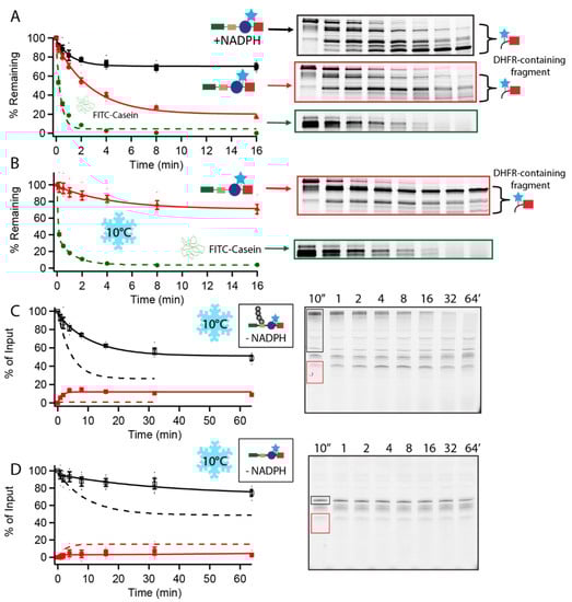 Proteolysis assays were carried out over 16 min time courses at 30 or 10 °C. Reactions contained 80 nM substrate, 0.0125 mg/mL thermolysin, 1 mg/mL BSA, 2 mM DTT, and 1% (v/v) DMSO in degradation buffer (50 mM TrisCl, 5 mM MgCl2, 5% (v/v) glycerol, and 0.1% (v/v) Tween-20 at pH 7.5). Reactions also contained 500 µM NADPH to stabilize DHFR as indicated. Reactions were quenched in 120 mM EDTA and analyzed via SDS-PAGE and fluorescence detection using a Typhoon FLA 9500.