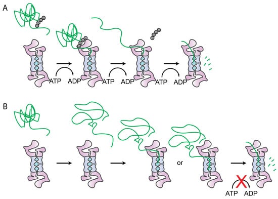 - Cresti, J.R.; Manfredonia, A.J.; Bragança, C.E.; Boscia, J.A.; Hurley, C.M.; Cundiff, M.D.; Kraut, D.A. Proteasomal conformation controls unfolding ability. Proc. Natl. Acad. Sci. USA 2021, 118, e2101004118. [Google Scholar] [CrossRef]