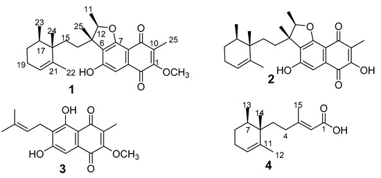 Compound 1 (1-methoxy neomarinone), with the molecular formula C27H34O5 established from the HR-MS data, was isolated from both the supernatant and the mycelial extracts. Two methyl doublets with resonance at δ 0.86 (H3-23) and H3-11 (δ 1.38) and an additional five methyl singlets at δ at 0.82 (H3-24), 1.31 (H3-25), 1.59 (H3-22), and H-1.96 (H3-26) were recorded in the 1H NMR spectrum (also compare Table 1). A total of 27 carbons were identified from the 13C which were further classified as 7 methyl, 4 methylene, 4 methine groups, and 12 non-protonated carbons based on the Distortionless Enhancement by Polarization Transfer (DEPT) data. Three spin systems were established from the COSY (correlation spectroscopy) data. The first spin system was deduced from the COSY correlations of H-17 to H3-23/H2-18 and H2-19 to H2-18/H-20. The structure assignment of the trimethylcyclohexene moiety was facilitated by the HMBC (heteronuclear multiple bond correlation) correlations of the three methyl groups. Cross peaks in the HMBC spectrum were recorded between H3-22 to C16/C-20/C21, H3-23 to C16/C-17/C18, and H-3 24 to C16/C17. The naphthalene-1,4-dione moiety connected to the furan ring elucidation was facilitated by the HMBC correlations of H3-25 to C1/C9/C10, H3-11 to C12/C13, H3-25 to C6/C12/C13/C14, and H-4 to C-2/C-3/C5/C6/C7. The furan ring was established from the HMBC cross peak of H-12 to C7 and the down field shift of C12 (δ 88.4) and C7 (δ 161.7). The typical 13C signals for the naphthalene-1,4-dione moiety with resonance at δ 181.4 (C2) and δ 183.5 (C9) completed the elucidation of this moiety. The hydroxy group and the methoxy group were attached to C5 and C1, respectively, based on the chemical shift of C5 (δ 158.7) and the HMBC correlations of methoxy group protons to C1 (δ 157.6). The two moieties were connected based on the COSY correlations of H2-14 to H2-15 and the HMBC correlations of the methyl groups’ protons H3-25 to C14 and H3-24 to C15, and consequently concluding the structure of 1.