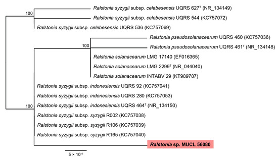 - Zhang, Y.; Qiu, S. Phylogenomic analysis of the genus Ralstonia based on 686 single-copy genes. Antonie Leeuwenhoek 2016, 109, 71–82. [Google Scholar] [CrossRef]