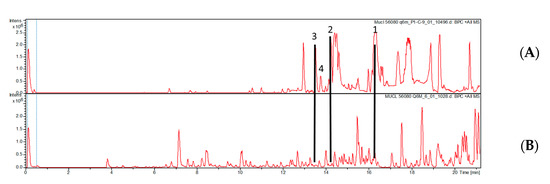HPLC chromatogram (210 nm) of the crude extracts of E. brachypora MUCL 56080 grown in Q61/2 media (A) and Q6 + antibiotics (B). Compounds 1–4 were only produced in the absence of the antibacterial antibiotic.